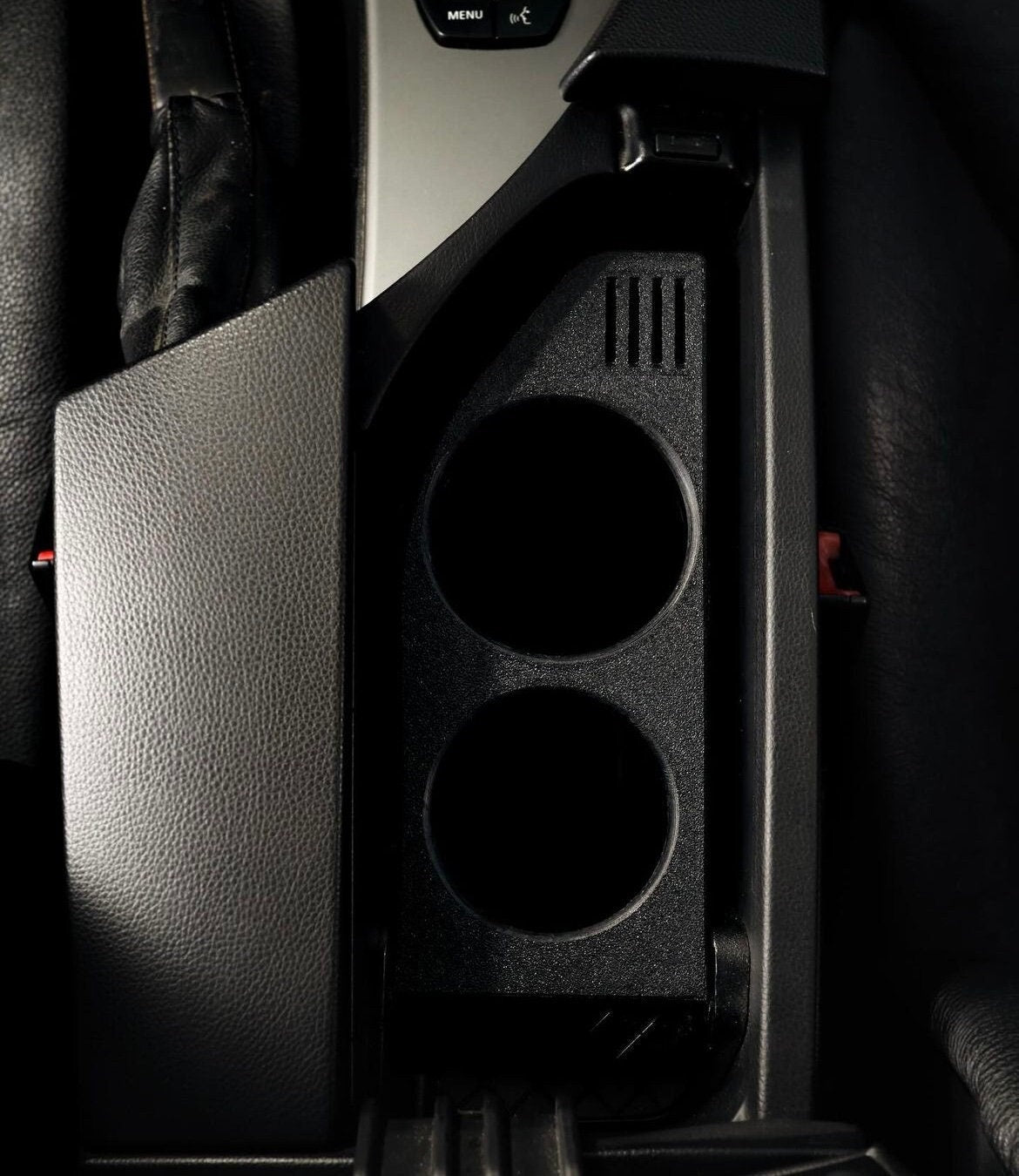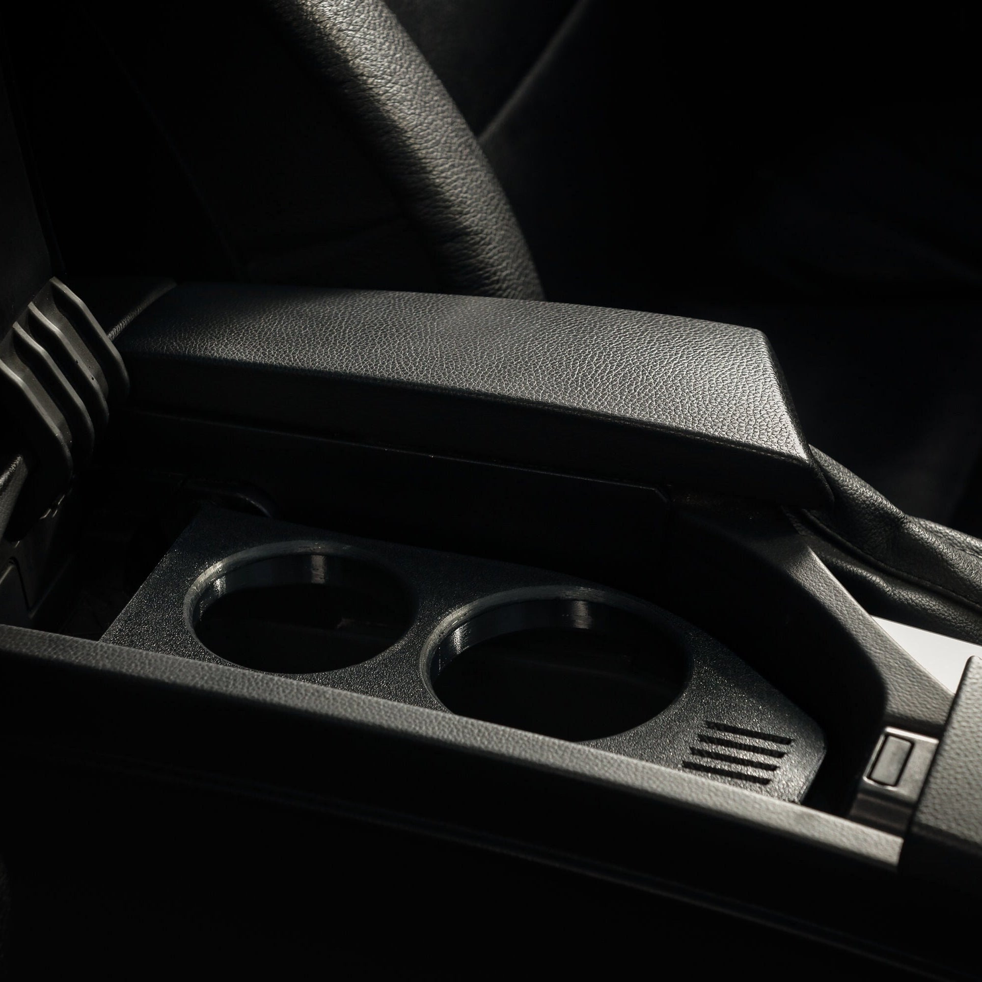 3D-tiskano držalo za pijačo za vaš BMW E60/E61. Držalo za pijačo je v črni barvi in ima dve odprtini – eno s premerom 66 mm in drugo s premerom 76 mm.